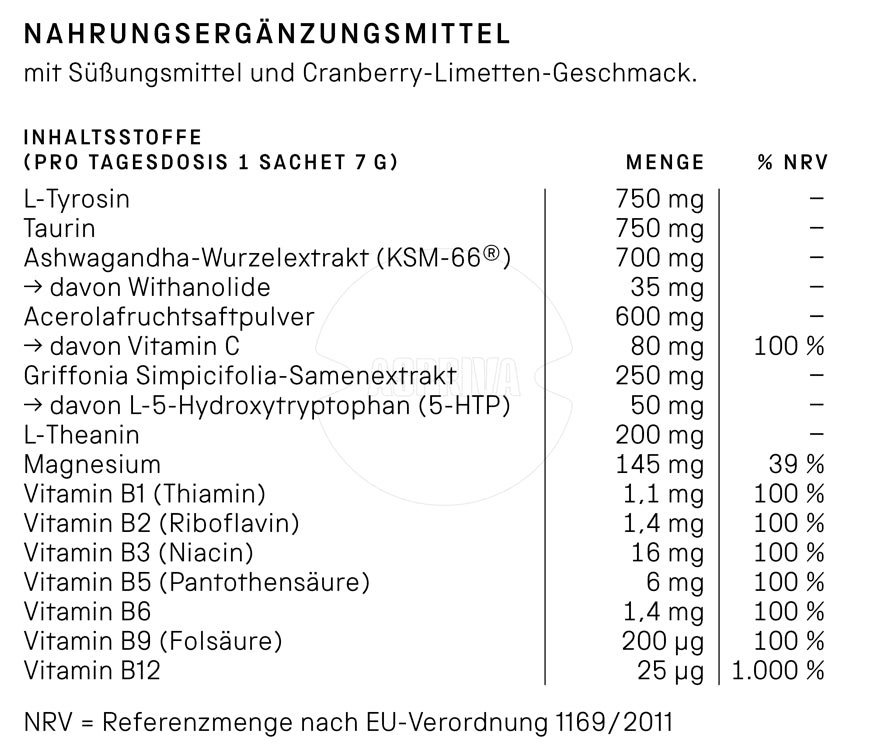 ASPRIVA® SMILE vereint wichtige Nährstoffe, die zur Unterstützung normaler Körperfunktionen beitragen können. L-Tyrosin , L-Theanin und Taurin sind Aminosäuren, die an verschiedenen Stoffwechselprozessen im Körper beteiligt sind. Ashwagandha ist dafür bekannt, die Stressbewältigung unterstützen zu können. Griffonia-Samenextrakt liefert 5-HTP, einen Vorläufer von Serotonin. Die enthaltenen Vitamine B1, B6, B12 sowie Magnesium tragen zur normalen Funktion des Nervensystems bei, während Vitamin C aus der Acerolakirsche hilft, die Zellen vor oxidativem Stress zu schützen.