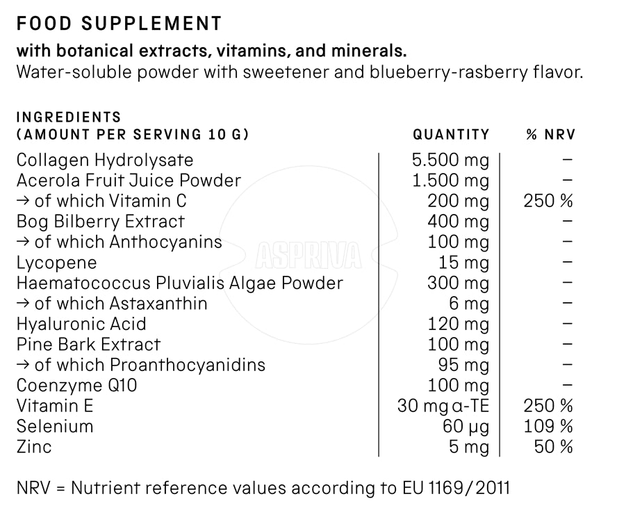 ASPRIVA GLOW contains selected ingredients, including vitamin C, which contributes to normal collagen formation for normal skin function. The formula is complemented by vitamin E, which helps to protect the cells from oxidative stress.