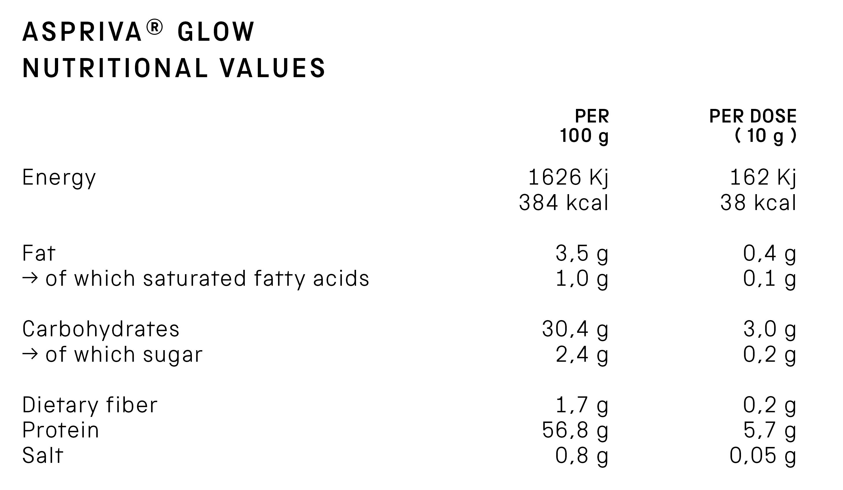 No, ASPIRVA® GLOW is not suitable for vegans because it contains a very high-quality collagen hydrolyzate that is obtained from animal sources. Collagen is an essential component of the skin structure and has been scientifically studied in this form for a long time. Vegan alternatives are often based on plant extracts or peptides that can support collagen metabolism, but in our view their effectiveness has not yet been sufficiently scientifically proven. That is why we rely on proven quality and bioavailable collagen peptides. This is what we mean by uncompromising, i.e. we would have liked to have offered a vegan option, but that would have required compromises.