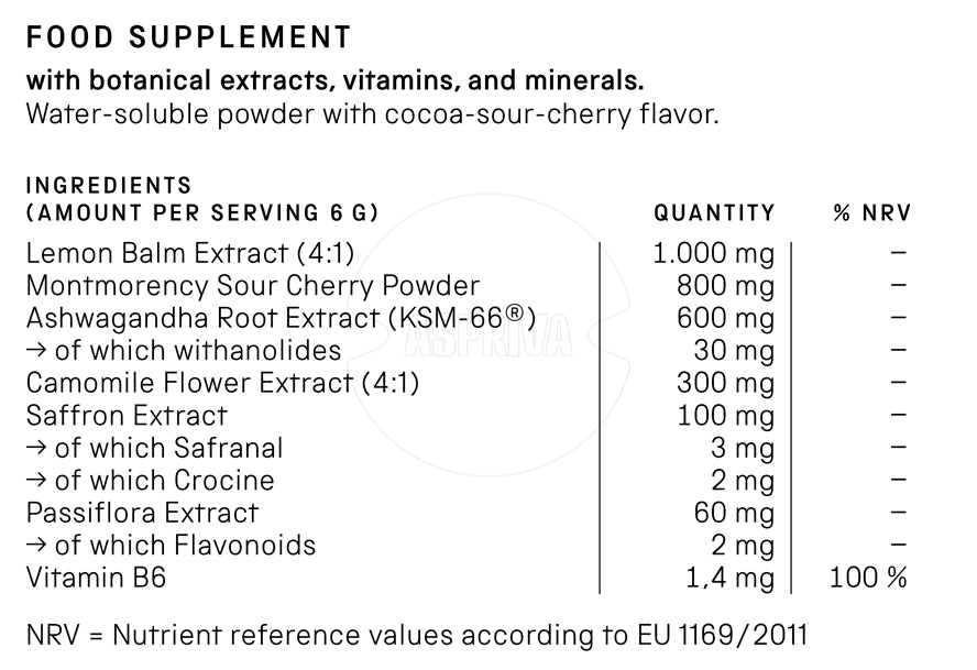 One cup of ASPRIVA SLEEP contains the plant power of around 15 cups of lemon balm tea, 5 cups of chamomile tea, 10 cups of passion flower tea, around 75 saffron threads, 6 g of raw ashwagandha root and over 50 Montmorency sour cherries. The ingredients are carefully dosed, standardized and prepared ready to drink.