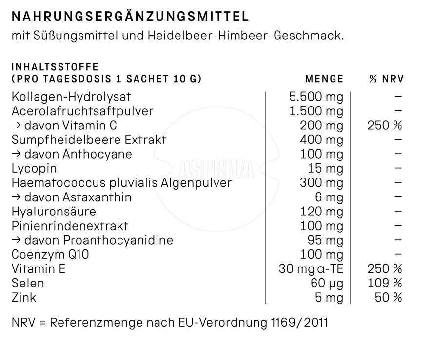 Bei ASPRIVA GLOW ist Kollagen nur ein Bestandteil unter mehreren wichtigen, da wir Hautgesundheit ganzheitlich begreifen. Es handelt sich um ein Getränk, das ausschließlich Inhaltsstoffe beinhaltet, die sich in relevanten Humanstudien unter Beweis gestellt haben. Dazu zählen Antioxidantien, Mikronährstoffe und Pflanzenextrakte, die für Schutz und Regeneration von mehr Glow von innen sorgen können.